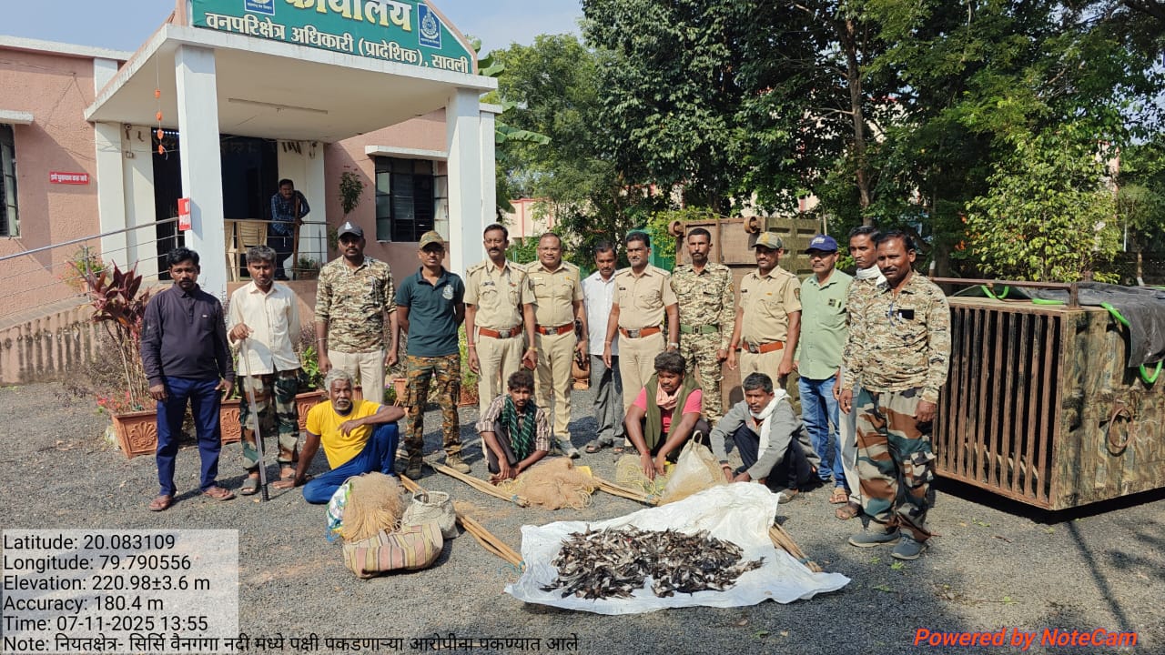 सविस्तर वृत्त असे की दरवर्षी पक्षी तज्ञ पद्मश्री स्व. मारुती चितमपल्ली यांच्या जन्मदिवस दिनांक 5 ऑक्टोंबर ते ज्येष्ठ पक्षी तज्ञ स्व. डॉक्टर सलीम अली यांच्या जन्मदिवस 12 नोव्हेंबर दरम्यान संपूर्ण भारतात पक्षी सप्ताह वनविभागातर्फे साजरा केला जातो या दरम्यान कोणते पक्षी स्थानिक आहेत आणि कोणते पक्षी बाहेर देशातून ,राज्यातून आले आहेत त्याचे जीवन क्रम व त्याची ओळख पटवून त्यांचा सखोल अभ्यास केला जातो दिनांक 7 नोव्हेंबर 2025 रोजी पहाटेच्या सुमारास सकाळी वनपरिक्षेत्रातील व्याहाड उपवनक्षेत्र नियतक्षेत्र सिर्सी मधील मौजा उमरी तलावात वन्यजीव सप्ताह साजरा करीत असता दरम्यान गडचिरोली जिल्ह्यातील 4 शिकारी वन्यजीव (संरक्षण) अधिनियम 1972 चे अनुसूचि -11, भाग- 2 मधील अनुक्रमांक 1001 वर समाविष्ट असलेल्या रेशाळ कंठाची भिंगरी या पक्षाची शिकार करीत असल्याची माहिती मिळाल्यावरून तात्काळ घटनास्थळ गाठून आरोपी 1) धोंडू गेडाम वय 34 वर्ष 2) बालाजी प्रताप बालाजी जराते वय 45 वर्ष 3) अरविंद धोंडू गेडाम वय 33 वर्ष 4) मुखरू सखाराम मेश्राम वय 65 वर्ष सर्व राहणार पारडी तालुका गडचिरोली यांना शिकार करताना जाळी -8 नग, थैली 5 नग नायलॉन दोरी 9 बंडल, बांबू काठ्या 16 नग, लाकडी खुंटी -8 नग, शिखरातील मृत पक्षी 225 नग, मोटर सायकल (CB Shine MH-33-X-0113 & Bajaj Discover MH-33-L-3165) 2 मग या शिकारातील मुद्देमालासह पकडण्यात आले.
