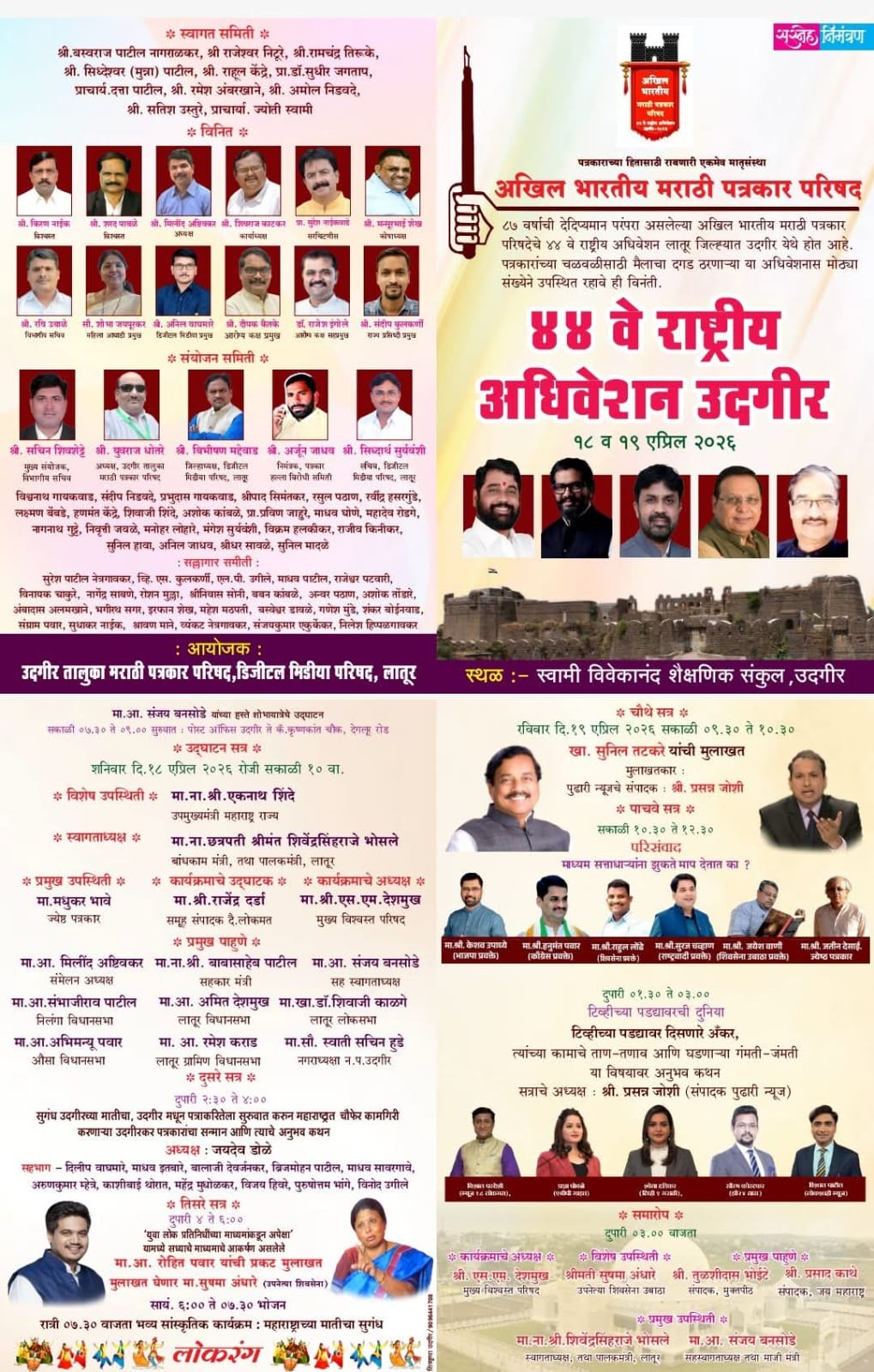 चंद्रपूर (प्रतिनिधी) अखिल भारतीय मराठी पत्रकार परिषदेचं 44 वं राष्ट्रीय अधिवेशन 18 आणि 19 एप्रिल 2026 रोजी रोजी उदगीर इथे होत आहे. उपमुख्यमंत्री मा. श्री. एकनाथ शिंदे कार्यक्रमास प्रमुख पाहुणे म्हणून उपस्थित राहात असून लोकमतचे समुह संपादक मा. श्री. राजेंद्र दर्डा अधिवेशनाचे उद्घाटन करतील.आ. श्री. सहकार मंत्री बाबासाहेब पाटील प्रमुख पाहुणे म्हणून उपस्थित राहणार आहेत.. बांधकाम मंत्री तथा लातूरचे पालकमंत्री मा. श्री. शिवेंद्रसिंहराजे भोसले अधिवेशनाचे स्वागताध्यक्ष आहेत तर आमदार मा. श्री. संजय बनसोडे सह स्वागताध्यक्ष आहेत. परिषदेचे मुख्य विश्वस्त मा. श्री. एस.एम.देशमुख हे कार्यक्रमाचे अध्यक्ष असतील तर मा. श्री. मिलिंद अष्टीवकर हे अधिवेशनाचे अध्यक्ष असतील. ज्येष्ठ पत्रकार मा. श्री. मधुकर भावे यांचे मार्गदर्शन पत्रकारांना लाभणार आहे.